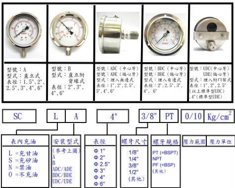 . 適用於不具腐蝕性之流體,但振動,脈動大之場合 . 類型:壓力,真空,聯成 . 材質:不鏽鋼外殼,銅接頭(密閉可充油或非密閉不可充油) . 型式:直立(A),直立附邊(B),埋入(AD),埋入附邊(BD ),附ㄇ架(UD) . 面徑:1.5",2",2.5",3",4",4.5",6" . 接頭:1/8",1/4",3/8",1/2",3/4"(NPT,BSP,BSPT, PS及UNF) . 接頭材質:銅原色,銅鍍鎳或銅鍍鋅 . 壓力範圍:依客戶需求 . 可選擇充油,不充油 . 適用溫度:流體溫度65C內(但另有耐高溫型,可依需求另行製造 ) 壓力表系列─數位壓力表/充油壓力表/一般壓力表/高壓壓力表 /微壓壓力表/接點壓力表/隔膜壓力表/冷媒表/特殊氣體用壓 力表/小型壓力表/方型壓力表/瓦斯表/冷煤表/壓力表配件 溫度計系列-溫度計保護套管/工業用玻璃溫度計/雙金屬溫度計 /隔測溫度計/角板型溫度計/可調角溫度計/金屬外殼玻璃溫度 計