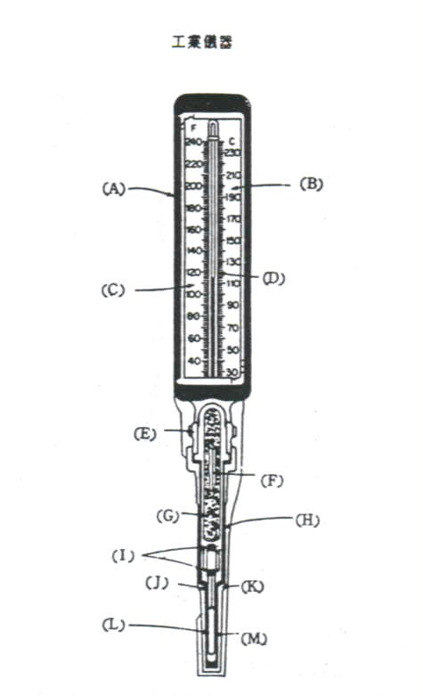 角板型溫度計 . 面板長度:6-1/2" . 外殼:塑膠 . 鏡面:玻璃 . 感溫玻璃棒:紅色有機液(量大可指定藍色) . 銅套管:1/2"PT公牙,不含牙1-1/2"長(不鏽鋼材質或其他尺 寸可訂製) . 製作溫度範圍:-50 ~ 200度C . 精度:+/-1刻劃 金屬外殼玻璃溫度計 . 面版長度:110/120/145/150/200 mm<依款式> . 外殼:圓型鐵電鍍/四方型鋁電鍍/鋁合金電鍍銅 . 鏡面:玻璃 . 感溫玻璃棒:水銀或有機液 . 銅套管:3/8"或1/2"PF/NPT公牙管長 40 ~ 200 mm<依指定> . 製作溫度範圍:-50 ~ +600 ℃ . 精度:±1刻度 下圖各代號為 (A)支架,(B)標度,(C)玻璃板,(D)毛細管玻璃罩, (E)旋轉鈕,(F)毛細管,(G)石綿繩,(H)支架, (I)墊料,(J)球莖室,(K)可分離罩,(L)球莖 (M)熱傳導介質 壓力表系列─數位壓力表/充油壓力表/一般壓力表/高壓壓力表 /微壓壓力表/接點壓力表/隔膜壓力表/冷媒表/特殊氣體用壓 力表/小型壓力表/方型壓力表/瓦斯表/壓力表/壓力表配件 溫度計系列-溫度計保護套管/工業用玻璃溫度計/雙金屬溫度計 /隔測溫度計/角板型溫度計/可調角溫度計/金屬外殼玻璃溫度 計
